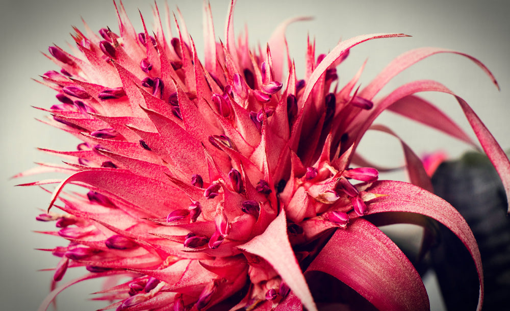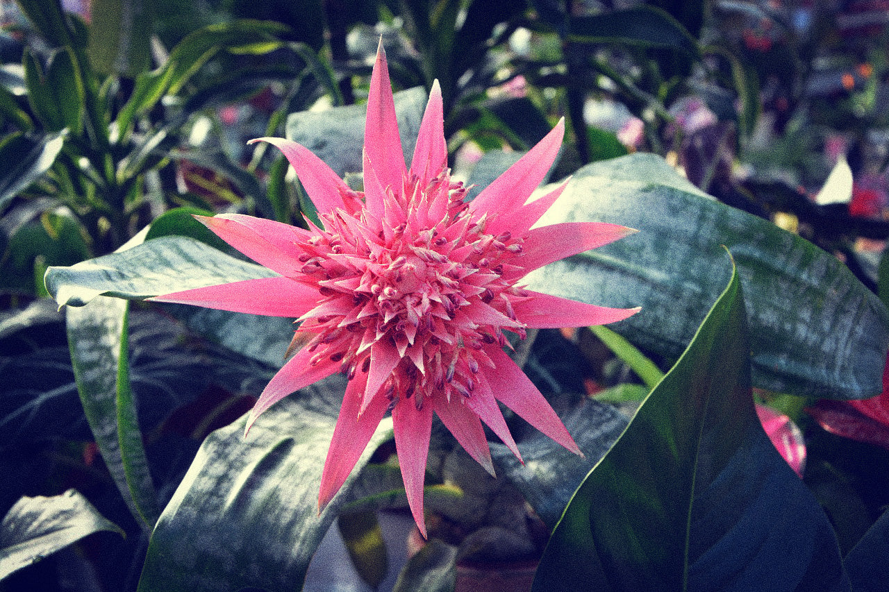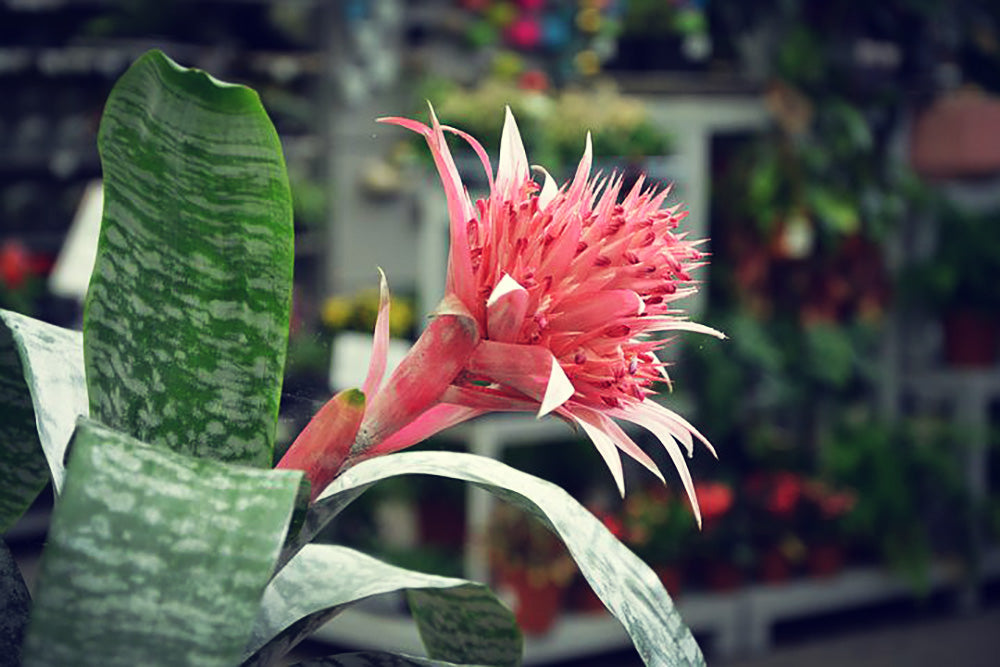 Dieser Urwald-Exote ist pflegeleicht und zudem ausgefallen. Mit ihren silbergrauen Blättern und rosa Hochblättern ist sie eine Augenweide und Bereicherung für jedes Zimmer. Die Rosette kann bis zu 60 cm hoch und etwa 40 - 50 cm breit werden. Sie blüht von Oktober bis November mit leuchtend rosa gefärbten Scheidenblättern und blauen Blüten, dabei ist der Blütenschaft 35 cm lang. Die Blüten verblühen jedoch nach einiger Zeit wieder.