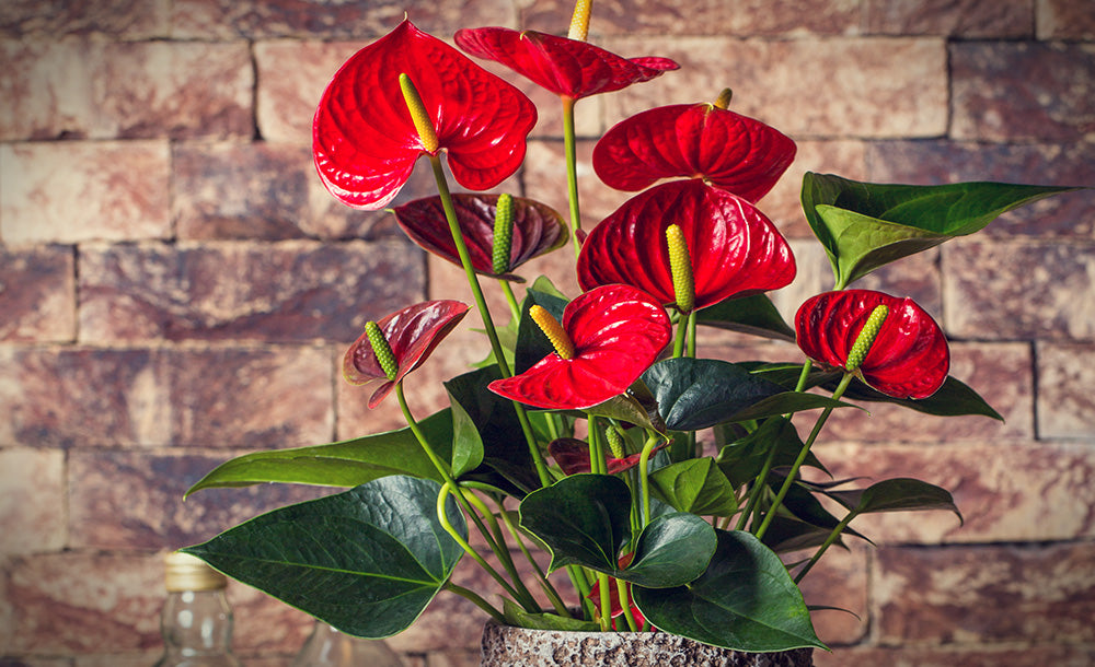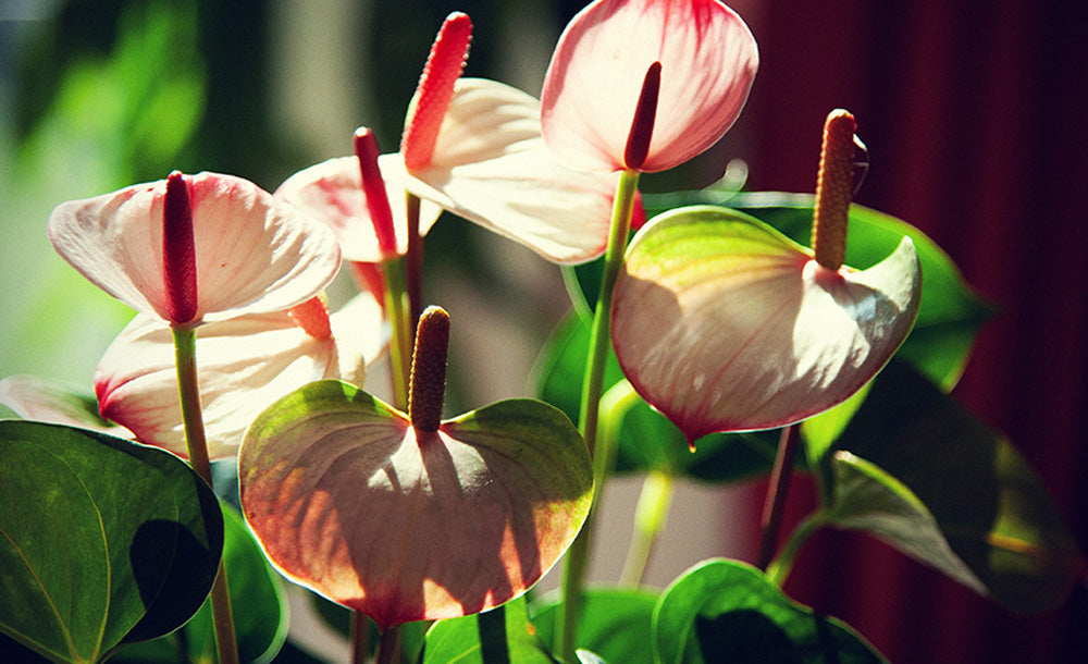 Die Flamingoblume oder Anthurie ist durch ihre besonderen Blätter ein echter Hingucker und eine absoluten Trendpflanze. Beeindruckend bei dieser Zimmerpflanze ist vor allem ihr bunter Blattschmuck, der fälschlicherweise meist für Blütenschmuck gehalten wird. Die eigentliche Blüte ist der in der Mitte der Hochblätter befindliche Kolben. Farblich kann er zwischen gelb, orange oder rot variieren. Gerade oder gebogen, leicht gedreht sein, da ist alles möglich. Diese Biegungen brachten der Pflanze den wenig schmeichelhaften Beinamen "Schweineschwänzchen" ein.