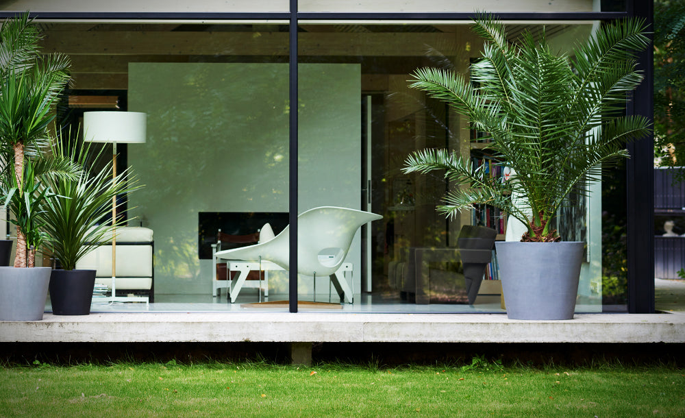 Die pflegeleichte Dattelpalme ist mit ihren langen Wedeln eine imposante Kübelpflanze. Während des Sommers kann sie mit nach draußen ziehen und bringt südländisches Flair auf deine Terrasse oder deinen Balkon. Dattelpalmen sind immergrüne Fiederpalmen mit unterschiedlich ausgeprägtem Stamm. Der Blattstiel ist dornig und während die Dattelpalme neue Blätter bildet, sterben die alten ab.