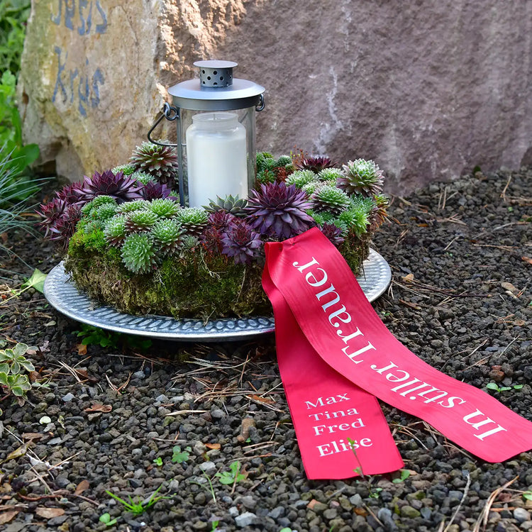 Ein lebender Trauerkranz ist eine besondere Form des Gedenkens – natürlich, langlebig und pflegeleicht. Gerade an sonnigen Grabstellen oder bei heißen Temperaturen stoßen klassische Blumengestecke oft an ihre Grenzen. Unsere bepflanzten Kränze aus Hauswurz und Torfmoos sind robust und dauerhaft für den Außenbereich geeignet. Sie kommen ohne zusätzliche Pflege aus, wachsen mit der Zeit weiter und passen sich der Umgebung an.