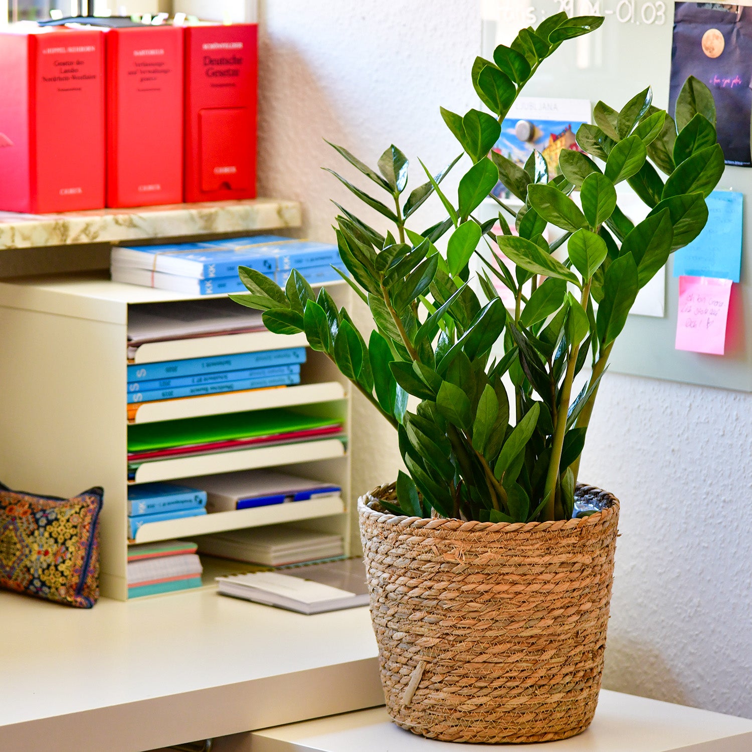 Die Glücksfeder ist eine sehr robuste und pflegeleichte Pflanze, die auch mit weniger Licht auskommt und nicht viel Wasser benötigt, da sie Wasser in ihren Blättern speichert. Sie macht dir nicht viel Arbeit und wird einfach immer schön aussehen. Perfekt für dein Büro.