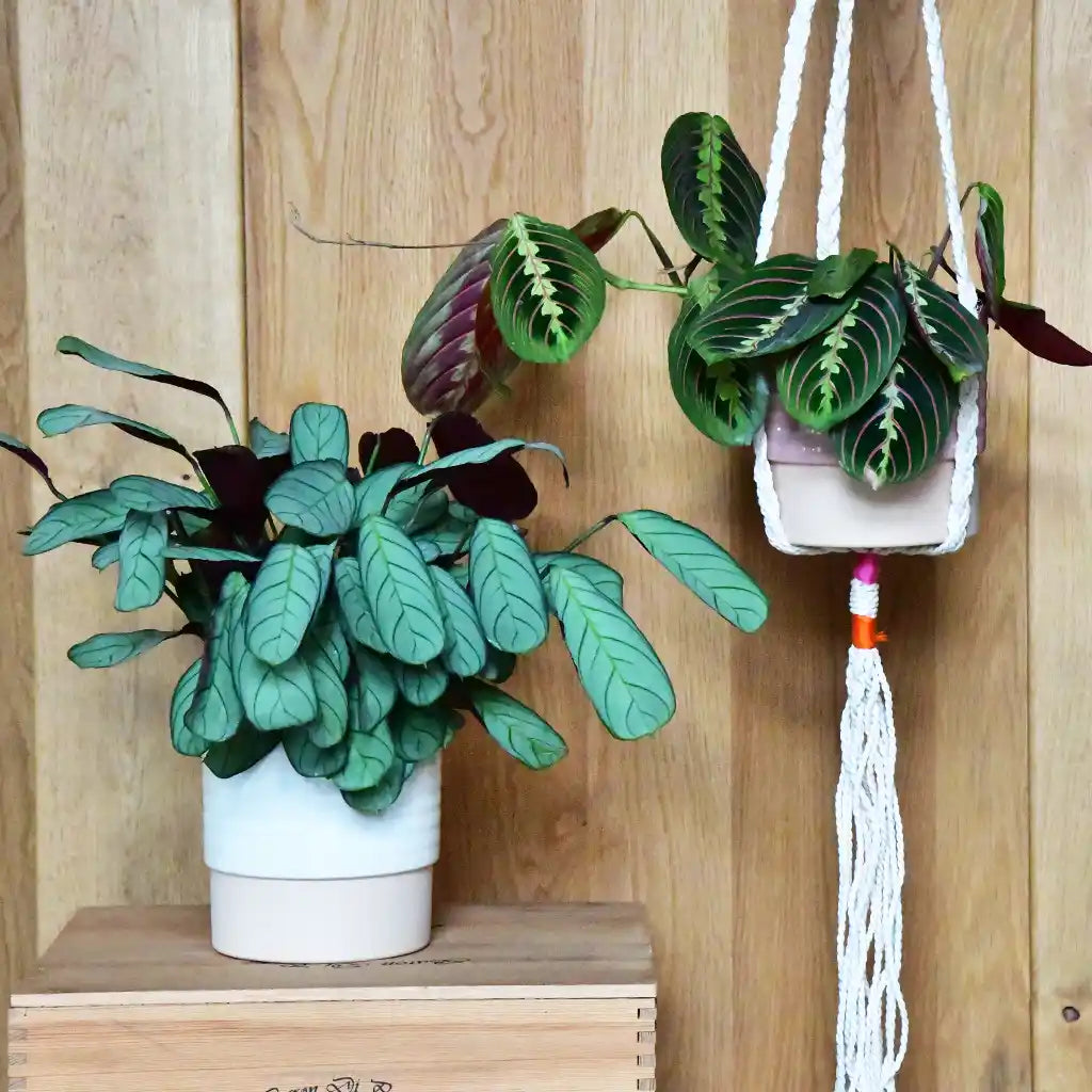 Dieses trendige Übertopf-Set passt perfekt zur 2er Pflanzenbox mit zwei kleinen Pflanzen. Die Kombination aus Keramiktöpfen und Makrameehänger ist perfekt geeignet, um hängende Pflanzen gemeinsam zu kombinieren.