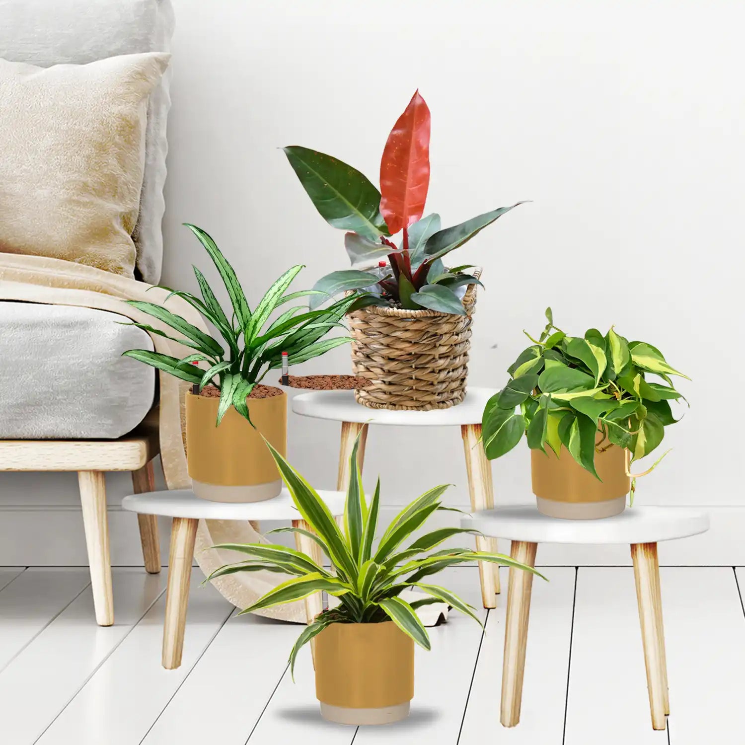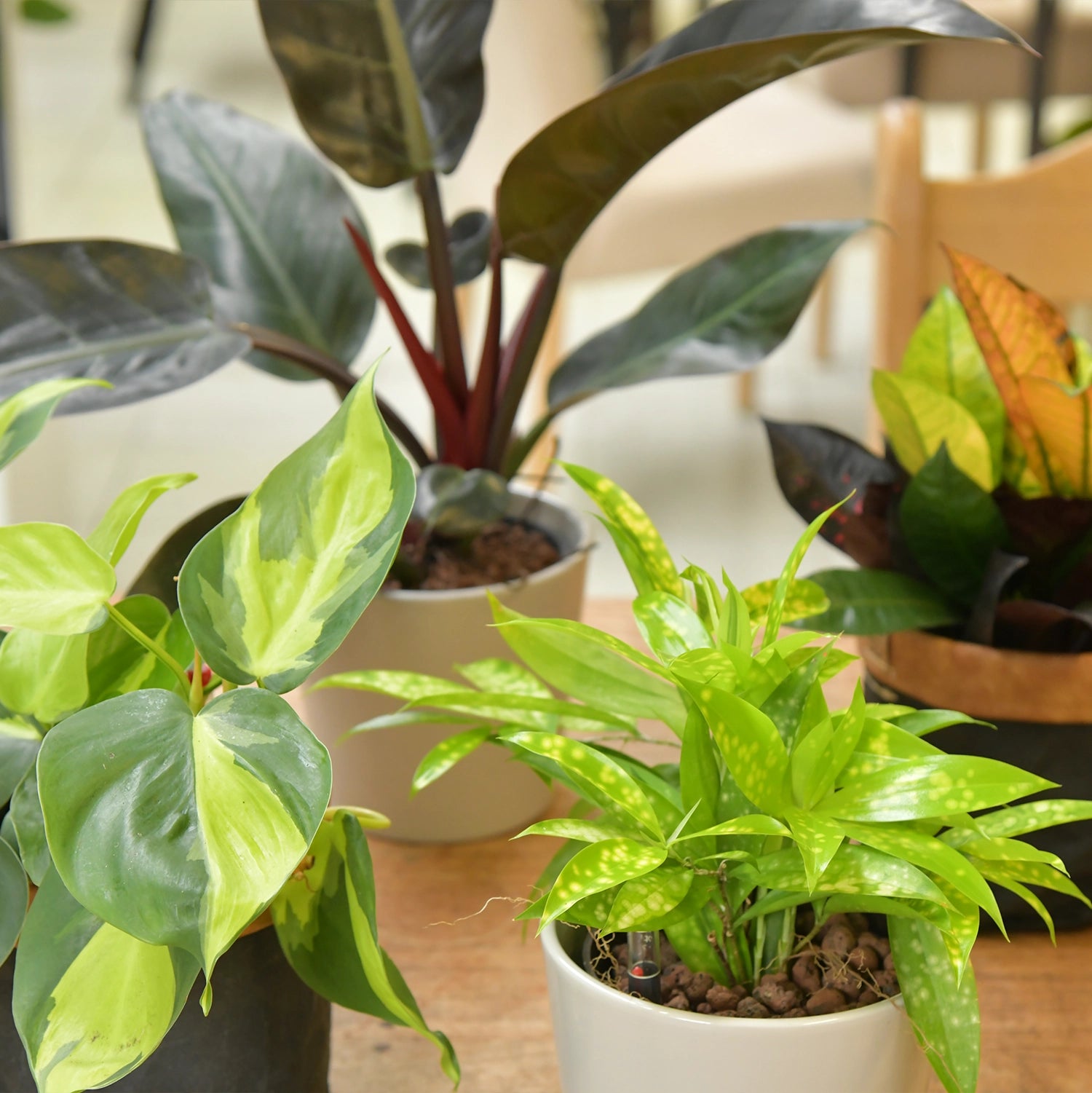 Alle vier Pflanzen sind besonders in ihrer Blattfärbung und werden die Blicke in deinem Wohnzimmer auf sich ziehen. Noch dazu sind sie als Hydrokultur besonders pflegeleicht und werden lange bei dir leben und wachsen. Denn mit dem praktischen Wasserstandsanzeiger der Hydropflanze hast du das Gießen im Griff.