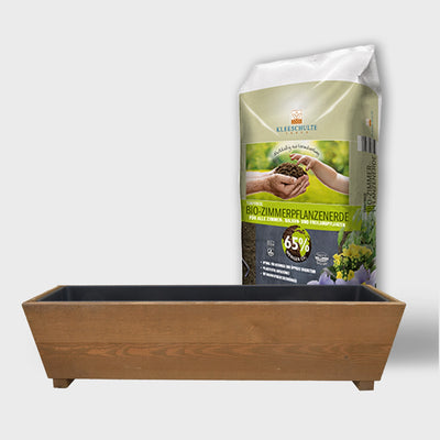 Du kannst den Balkonkasten nun an einer Balkonkastenhalterung aufhängen oder ihn auf die Fensterbank, Regal, Mauer,... stellen. Dank der Holzbalken an der Unterseite kann überschüssiges Wasser, das aus dem Balkonkasten läuft, auch hier gut ablaufen.