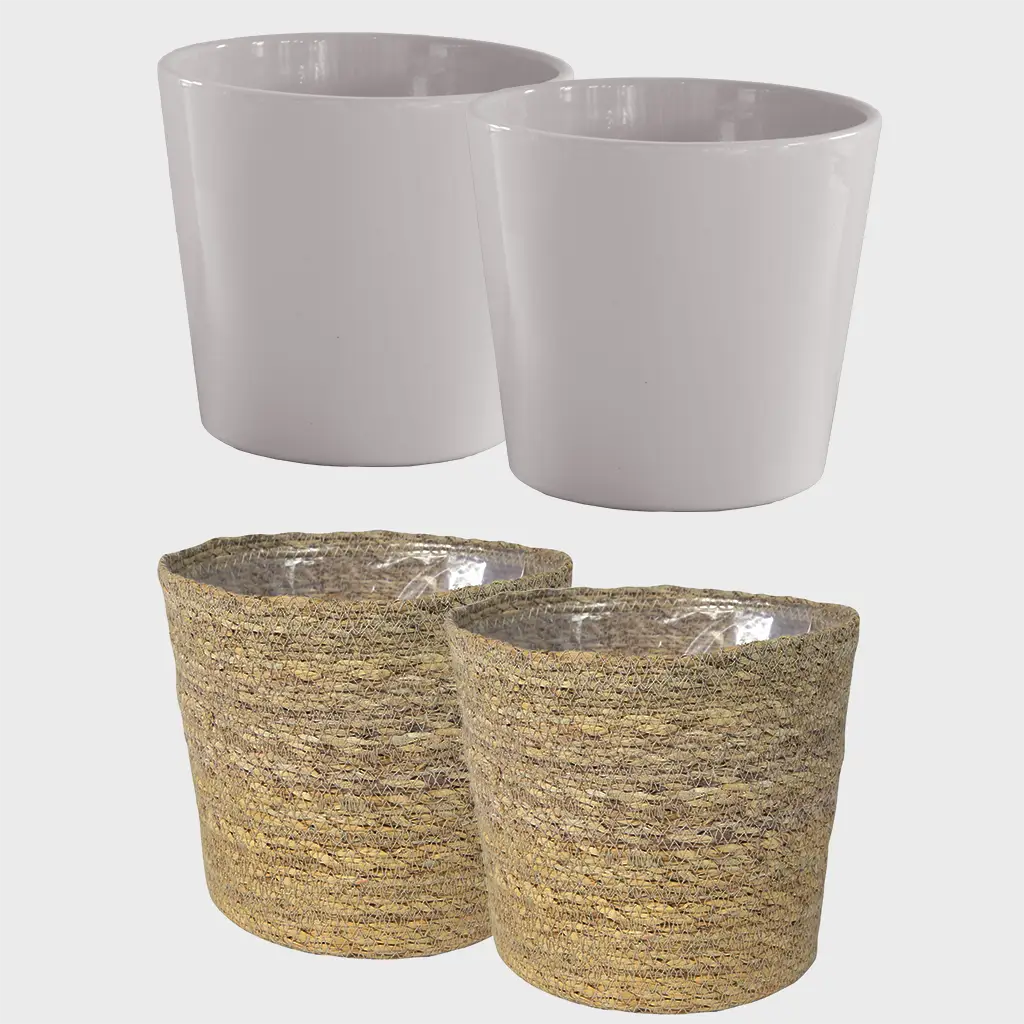 Dieses trendige Übertopf-Set haben wir dir passend zur 4er Pflanzenbox mit vier Hydrokultur Pflanzen zusammen gestellt. Die Töpfe sind eine Mischung aus Keramik und Seegras. Modern und doch klassisch ist die Kombination aus Tara und Korb ein passendes Accessoire für einen natürlichen und warmen Einrichtungsstil. Dank eines Topfeinsatzes im Seegraskorb sind beide Töpfe 100% wasserdicht und passen perfekt zu der Topfgröße der Hydrokulturpflanzen.