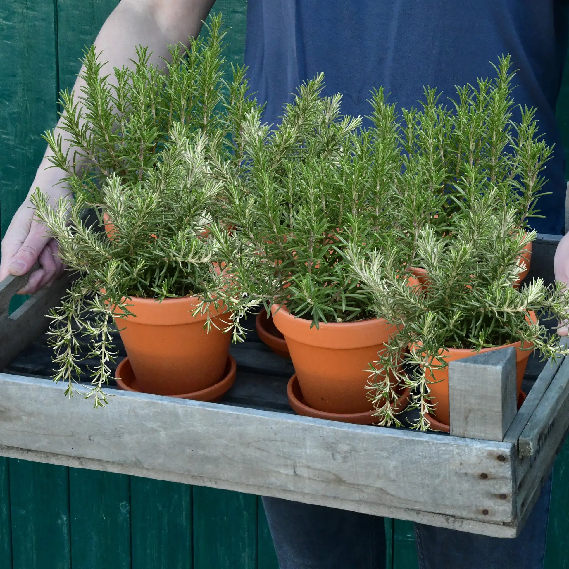 Rosmarin kann man nie genug haben. Er eignet sich als Tischdeko, zum Bepflanzung von Balkonkästen, Kübeln oder auch als kleine Hecke. In diesem 6er Set bekommst du drei stehende Rosmarin und drei hängende Pflanzen. Diese sind mit ihren knorkeligen Trieben ein besonderer Hingucker zur Einzeldeko oder als rankende Pflanze in Kombibepflanzungen.