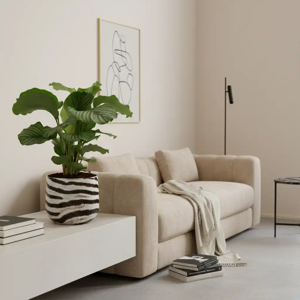 Dieser Zebratopf passt perfekt in helle Räume, in denen Ruhe und Design im Mittelpunkt stehen. Der Look ist modern, clean und genau richtig, wenn du es stilvoll, aber nicht verspielt magst. Er ergänzt minimalistische Einrichtungen und klare Linien auf eine besonders hochwertige Art. Wenn du Kontraste liebst, aber auf Farbe verzichten möchtest, ist dieser Topf ideal für dich. So wird deine Pflanze zum dezenten Design-Statement in deinem Raum.
