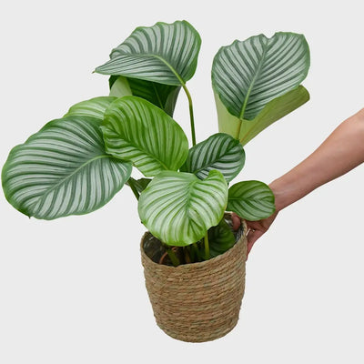 Ihre großen Blätter der Calathea Makoyana in hellgrüner und dunkelgrüner Maserung sind ein absoluter Hingucker. Sie ist mit ihrem filigranen Blattmuster wie gezeichnet aus und ist nicht nur schön anzuschauen, sondern sorgt auch für ein besseres Raumklima und ist ungiftig für Tiere.