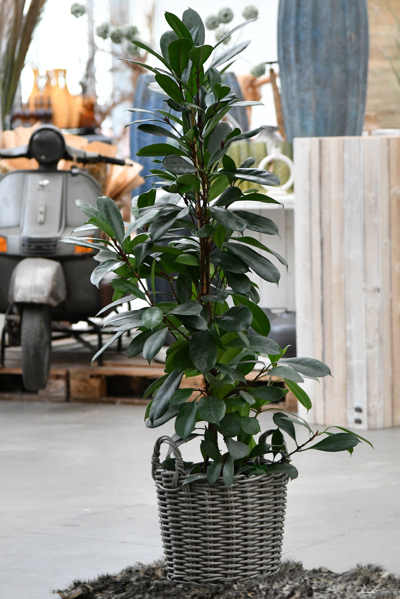 Dieser Ficus ist ein unkomplizierter seiner Art. Er hat feste dunkle Blätter und dabei die typisch buschige Form, die den Ficus so natürlich aussehen lässt. Mit einer Höhe von rund 1,40 ist er perfekt für die Raumdeko zu Hause oder das Büro geeignet.