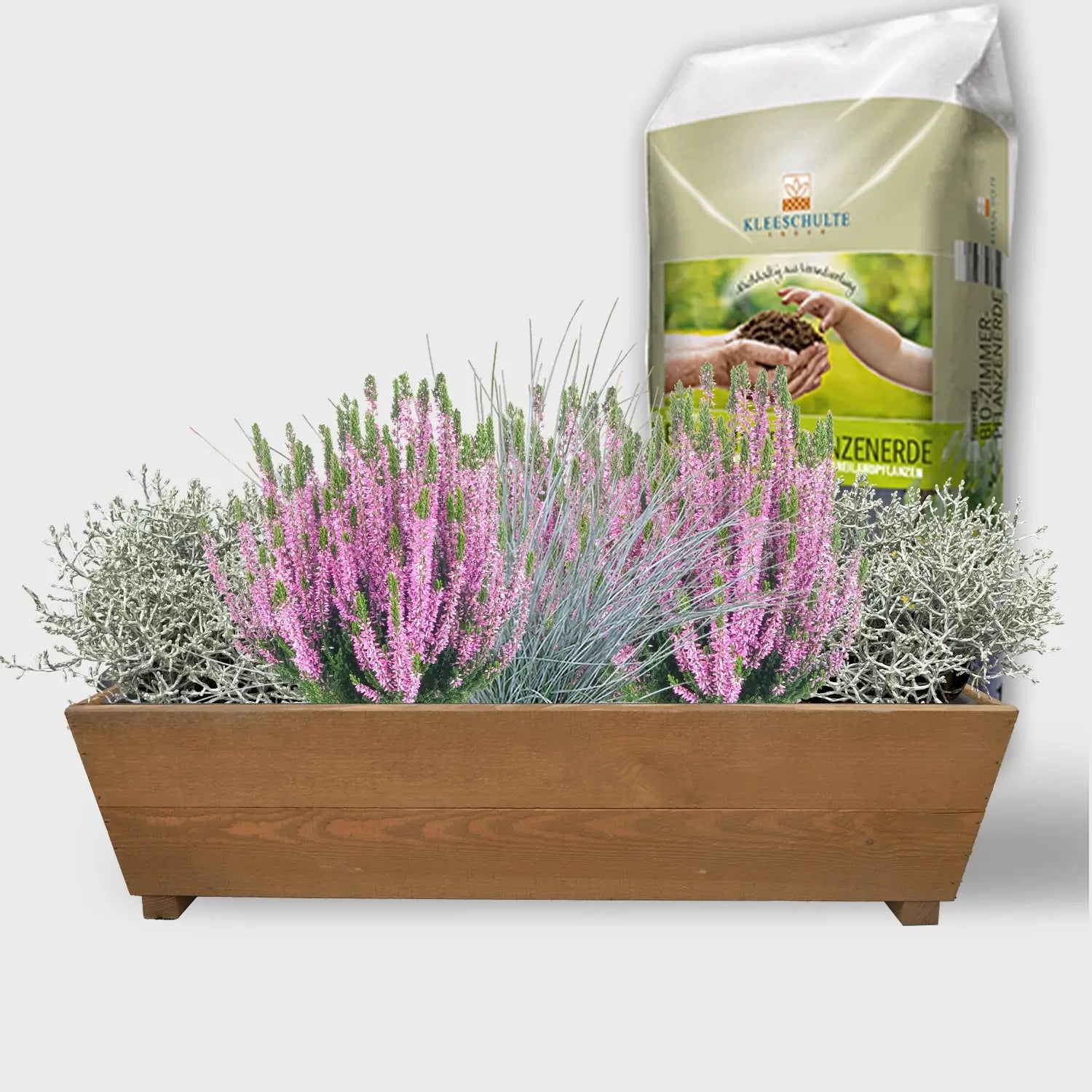 Mit dem Set aus Pflanzen, handgefertigtem Holzbalkonkasten mit Inlay und hochwertiger Erde haben wir dir eine Dekoration für den Herbstbalkon zusammengestellt, bei der alles zusammen paßt. Trendige, silberlaubige Herbstpflanzen mischen sich mit lila Heidepflanzen. Die Pflanzmischung hält über den Winter bis ins kommende Frühjahr und verlangt nicht viel Aufmerksamkeit. Perfekt für Einsteiger und alle, die wissen, was gut ist.