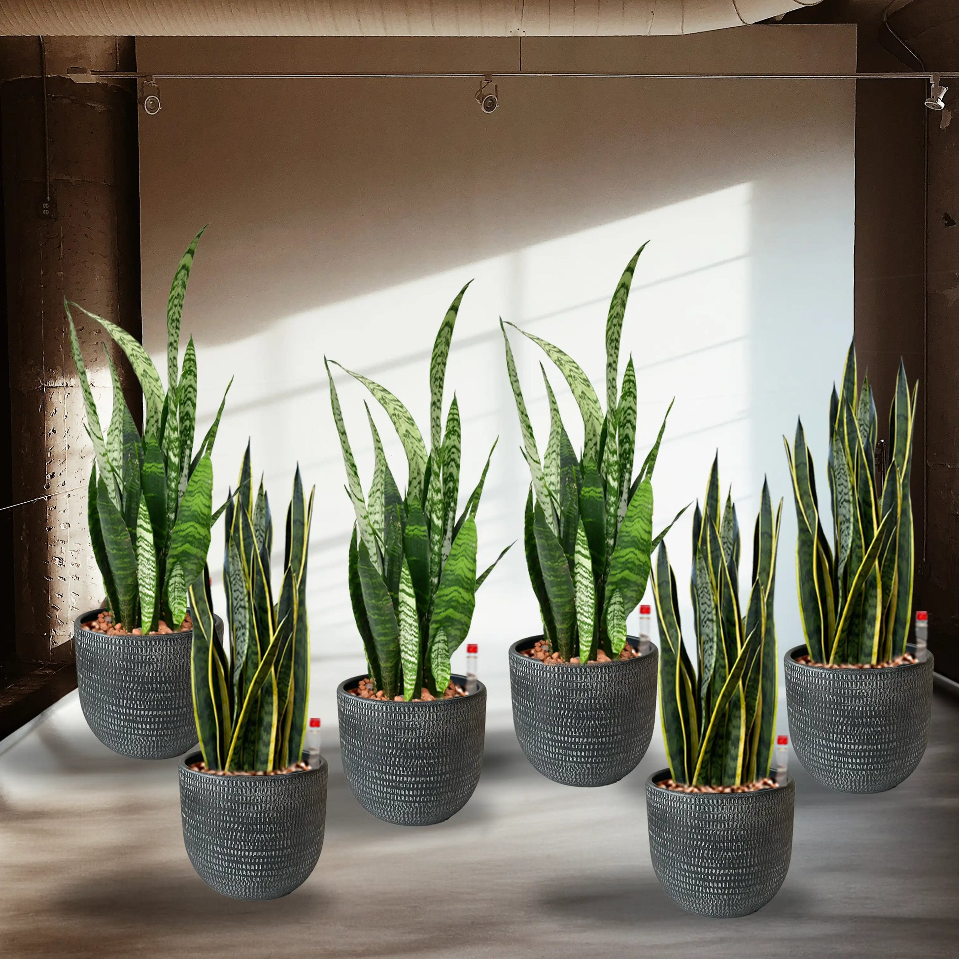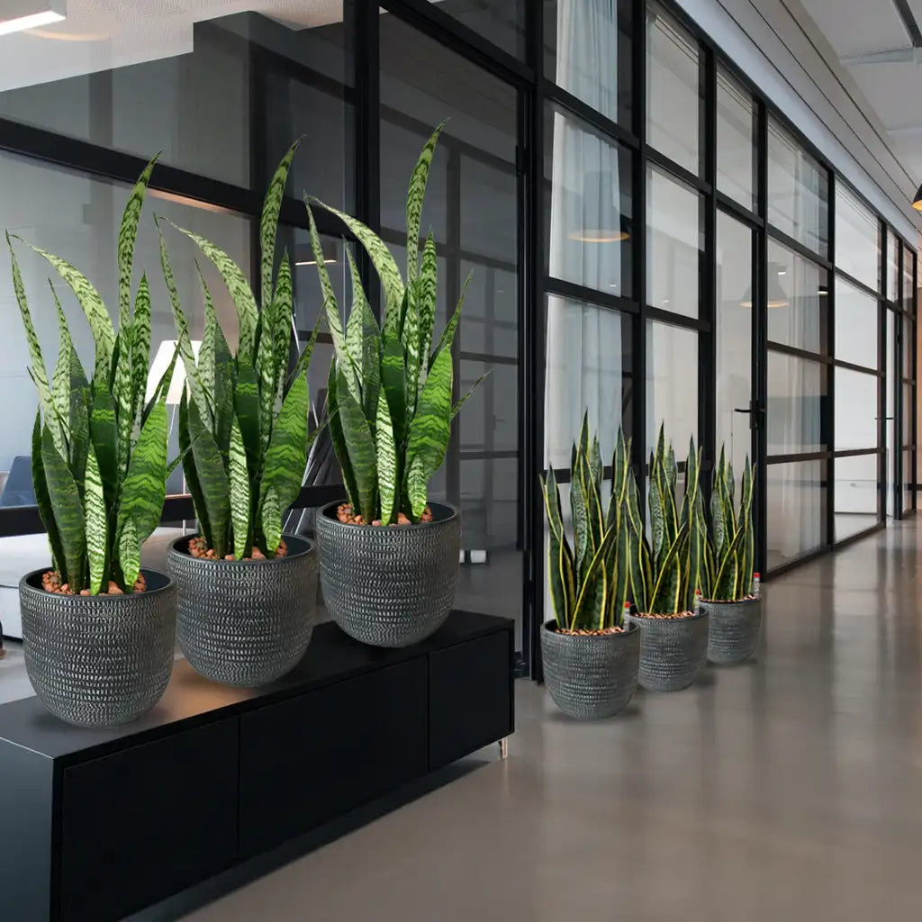 Sansevierien alias Bogenhanf sind Retro und stylisch zugleich. Vor allem sind die Sukkulenten aber pflegeleicht und Alleskönner. Sie halten direkte Sonne und Standorte mit wenig Licht aus und sind immer unverändert schön. Sie passen perfekt in moderne Büros oder Praxen, wo es sehr hygienisch zugeht, denn hier fällt kein Blatt.