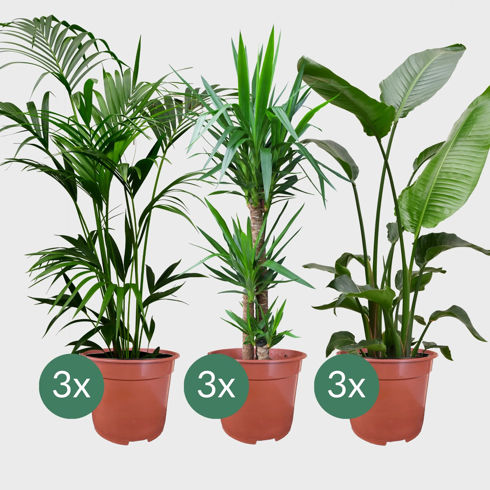 Stelitzie und Yuccapalme stehen gerne an einem sonnigen sehr hellen Platz und brauchen sehr wenig Wasser. Für die Kentia Plame mit ihren robusten Wedeln, kann es auch gerne etwas dunkler sein.