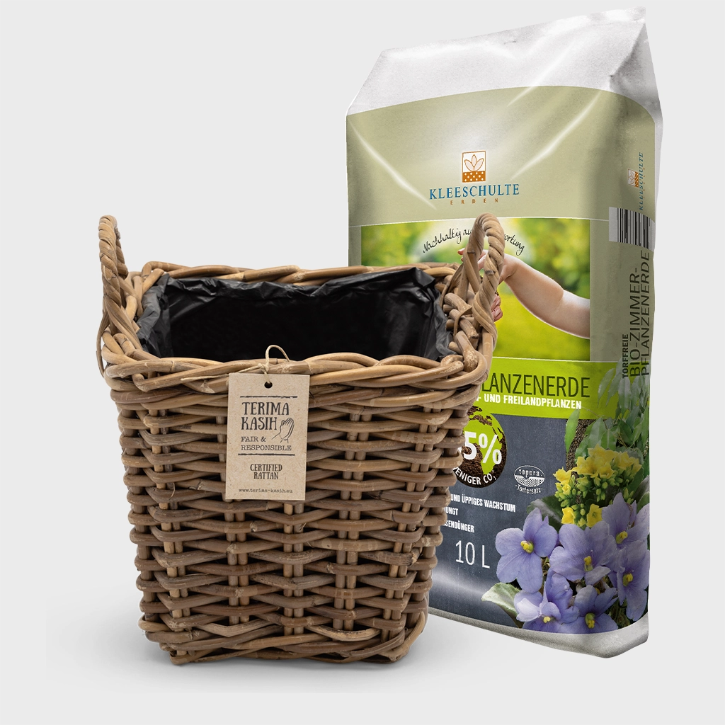 Mithilfe der mitgelieferten Erde kannst du deine Pflanze direkt in den Korb einpflanzen. Die Innenseite des Korbes ist mit einer Kunststoffauskleidung versehen, die ein Auslaufen verhindert, jedoch sollte kein Wasser im Topf stehen. Möchtest du den Korb für deine Pflanzen auf dem Balkon nutzen, lohnt es sich vor dem Einpflanzen Löcher in die Folie zu ritzen, damit überschüssiges Wasser ablaufen kann.