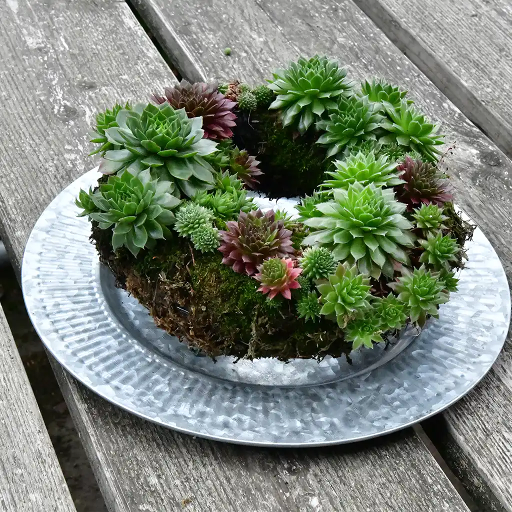 Dein lebender Kranz ist eine schöne Tischdeko, den du perfekt mit dieser Schale als Unterteller kombinieren kannst. Die goldene Farbe verleiht der Tischdeko einen edlen Glanz und hebt die Pflanzen besonders gut hervor.