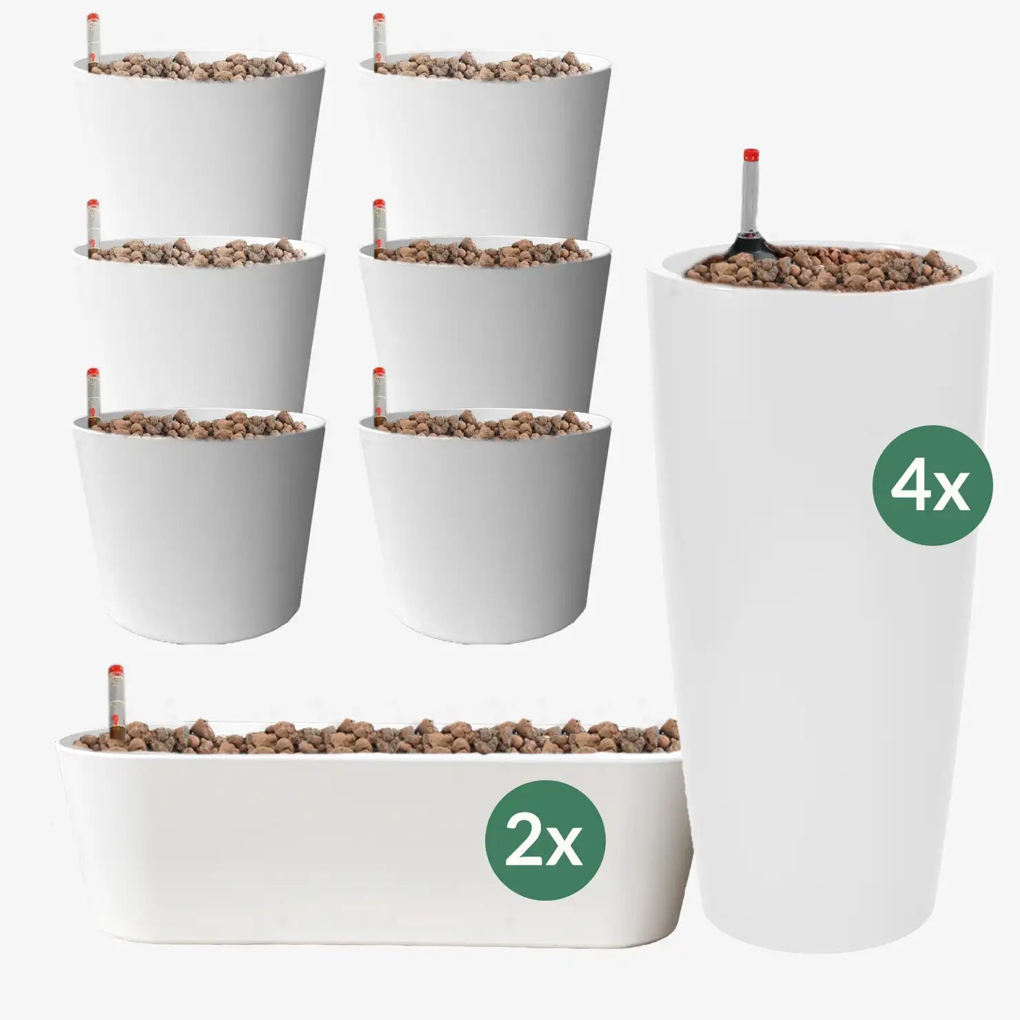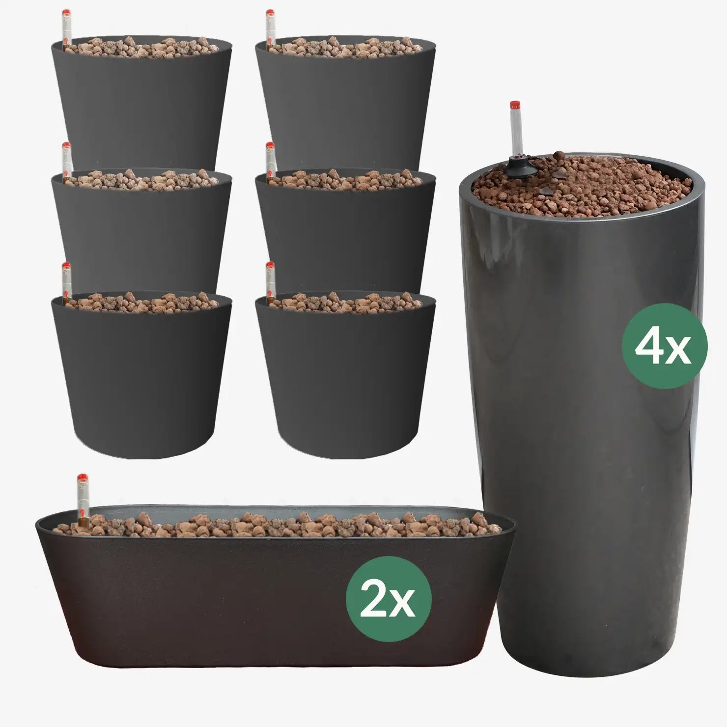 Dieses Set aus verschiedenen Gefäßen ist perfekt für dein Palettenset geeignet. Die Mischung aus hohen Vasen, Sideboard und kleinen Töpfen ist perfekt für die Ausstattung eines Büroraums geeignet.