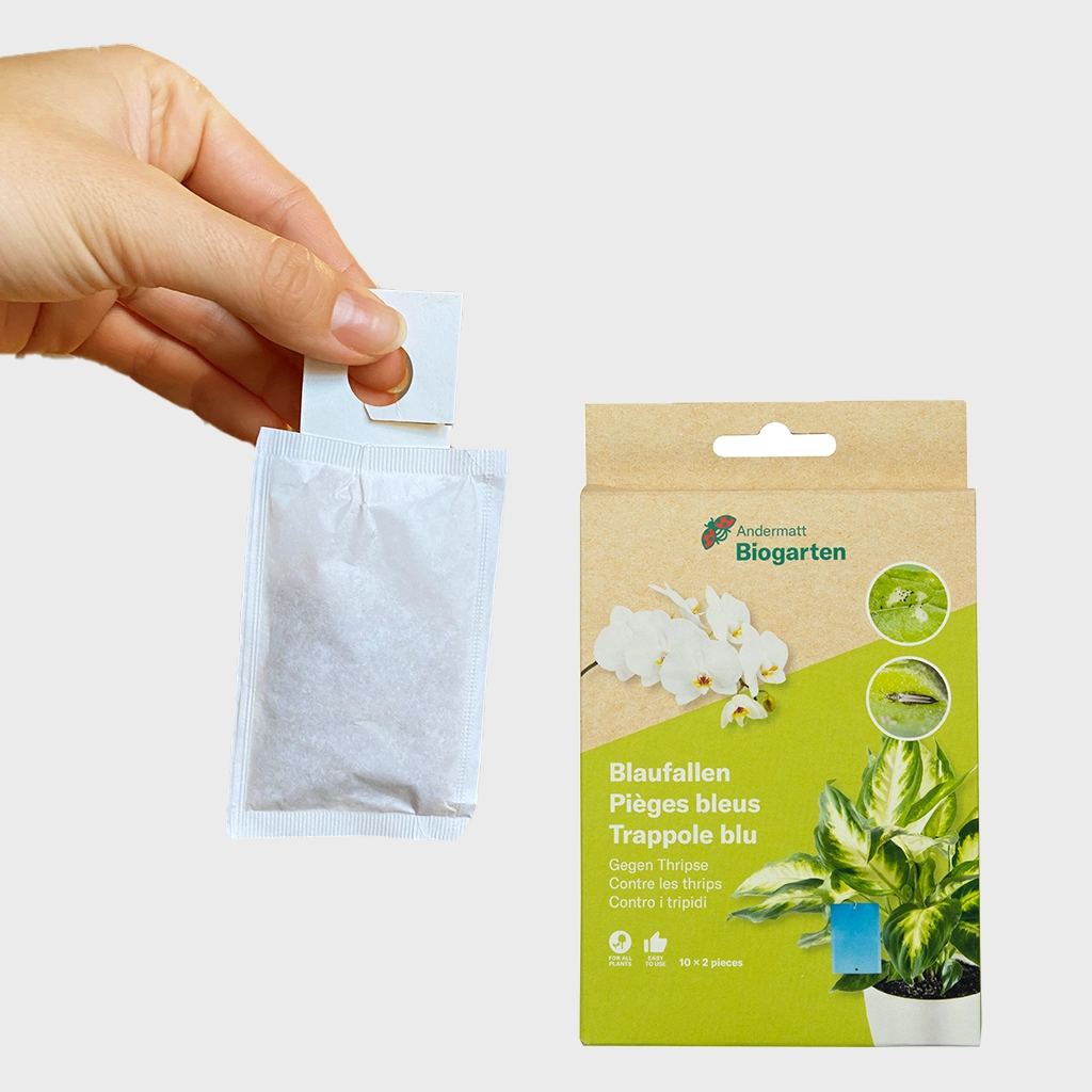 Du kannst neben der Beobachtung deiner Pflanze auch Hilfsmittel zu Hand nehmen, um dir ganz sicher zu sein. Zum Monitoren von Thripsen kannst du gut Blautafeln einsetzten. Diese Tafeln sind von beiden Seiten mit einer Lehmschicht bedeckt, an denen die Thripse hängen bleiben. Durch die blaue Farbe werden diese angezogen und so gefangen.