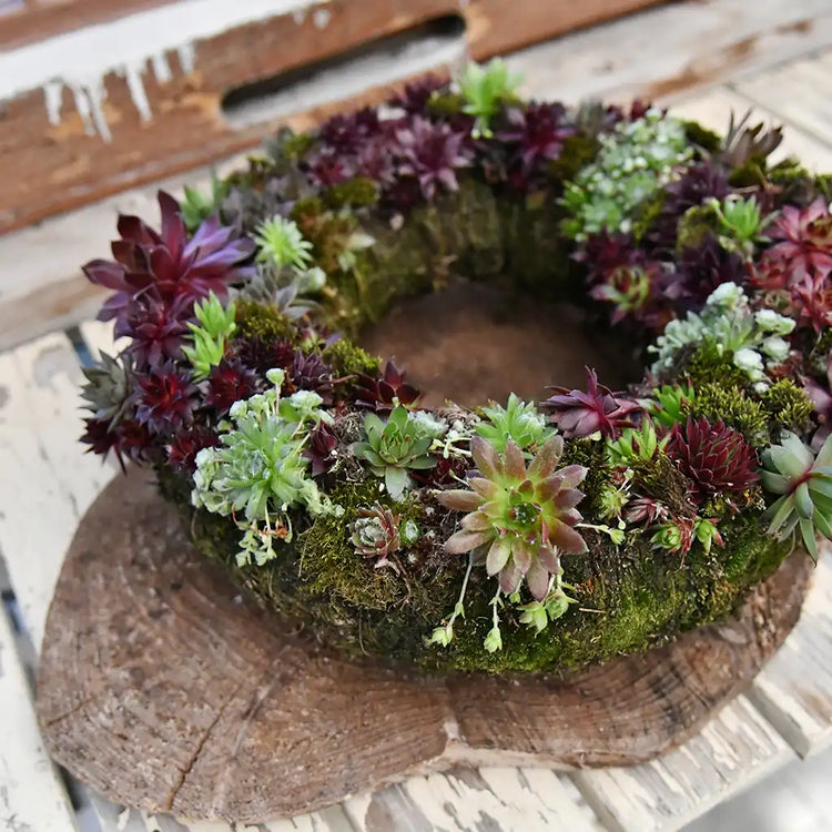 Die Mooskränze bewachsen mit Sempervivum sind eine hochwertige und individuelle Tischdekoration für Draussen. Schmücke deine Terrasse mit diesem exklusiven, winterharten und tierfreundlichen Dekohighlight.