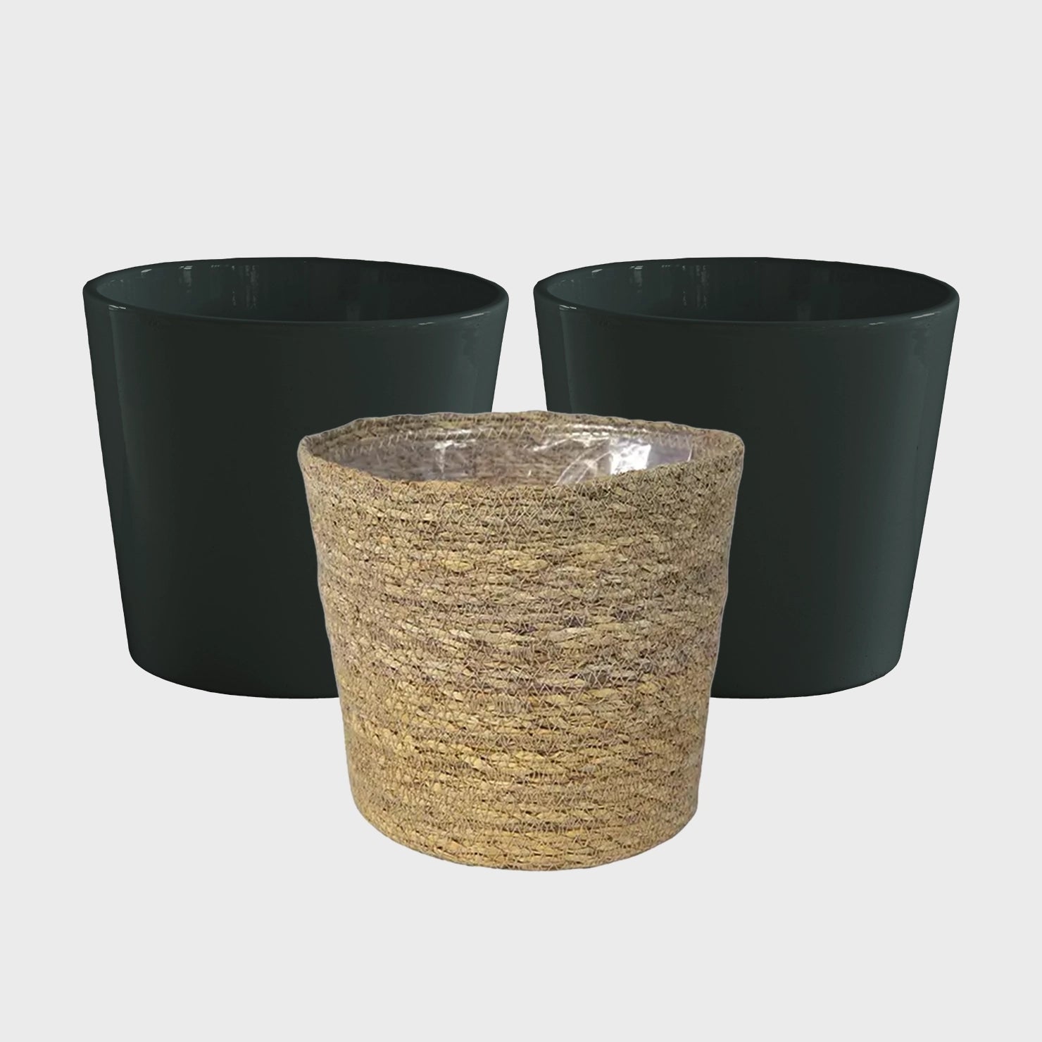 Dieses trendige Übertopf-Set passt perfekt zur 3er Pflanzenbox mit drei Pflanzen in einem 13-15cm Pflanztopf. Die Töpfe sind eine Mischung aus Keramik und stylischem Seegrasgepflecht. Einfach mitbestellen und deine neuen Pflanzen kinderleicht in deiner Wohnung dekorieren.