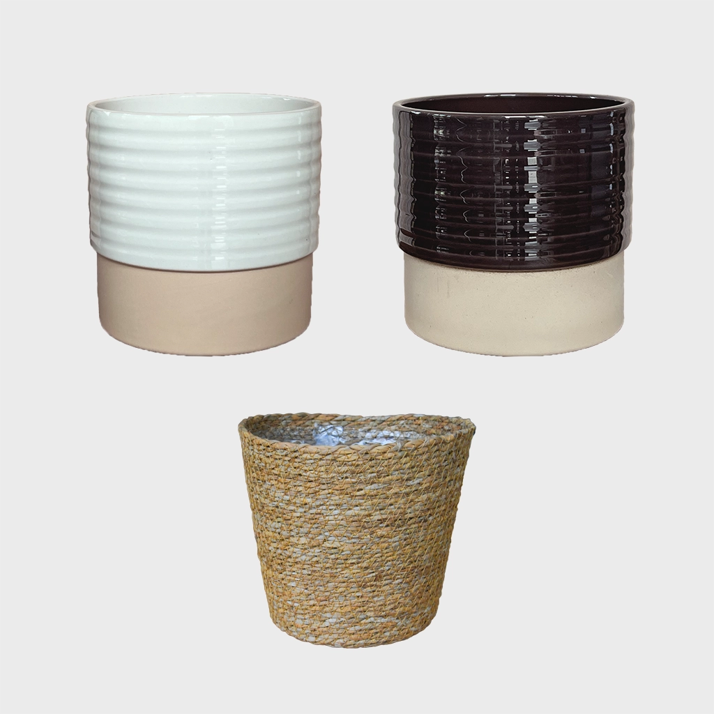 Dieses natürliche Übertopf-Set passt perfekt zur 3er Pflanzenbox mit kleinen Pflanzen. Die Kombination auf braunen und natürlichen Übertöpfen mit dem creme-weißen Eno Wave machen die Kombi perfekt für eine Deko mit erdigen Tönen. Die edle Lasur macht die Keramiktöpfe besonders beliebt.