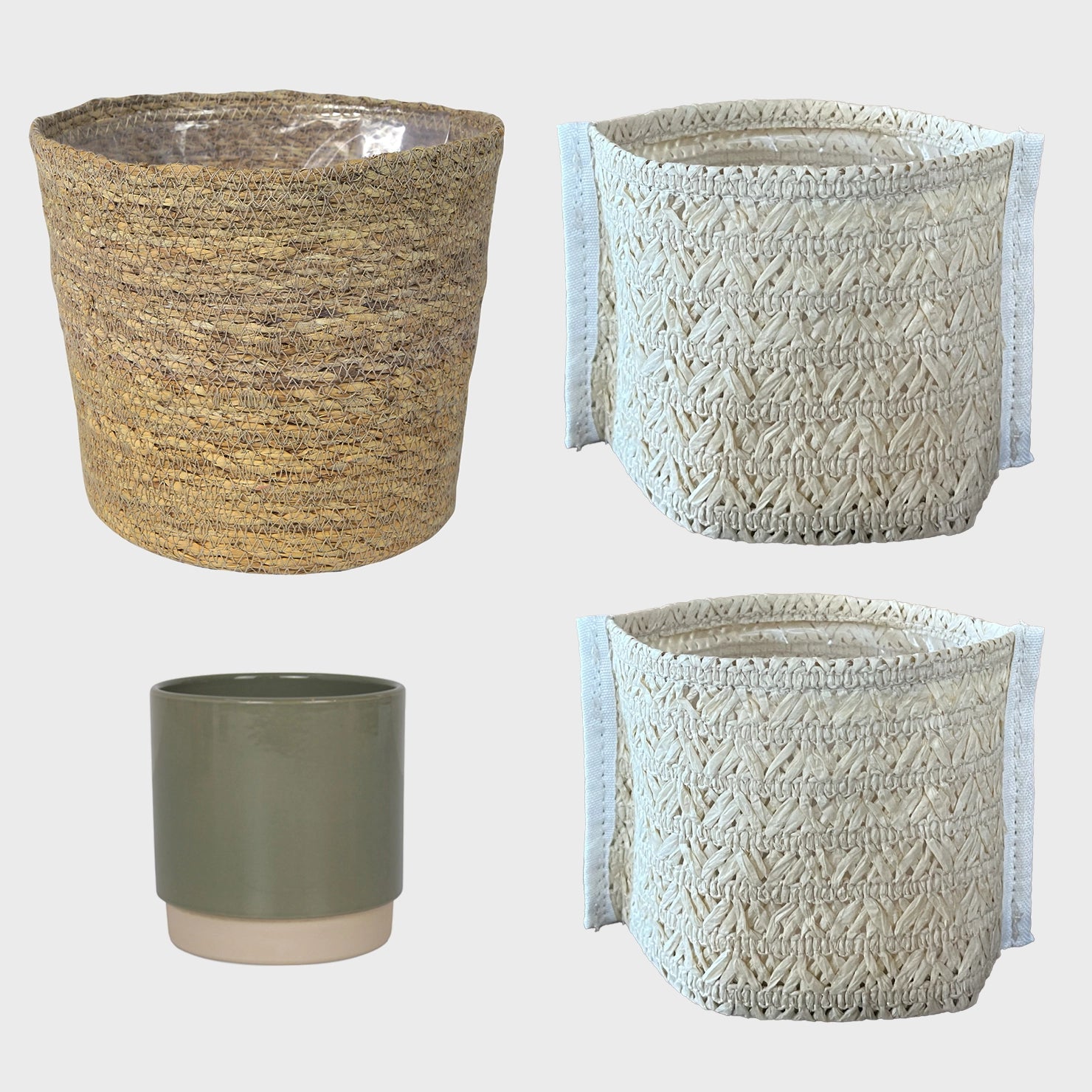 Dieses trendige Übertopf-Set haben wir dir passend zur 4er Pflanzenbox mit 3 großen und 1 kleinen Pflanze zusammengestellt. Die Töpfe sind eine Mischung aus Keramik, modernen Übertopf-Bags und stylischem Bastgeflecht. Die Innenseite des Korbes und der Sizo Bags ist mit einer Kunststoffauskleidung versehen, die ein Auslaufen verhindert, jedoch sollte kein Wasser in den Gefäßen stehen. Einfach mit bestellen und deine neuen Pflanzen kinderleicht in deiner Wohnung dekorieren. Erhältlich in verschiedenen Farben.