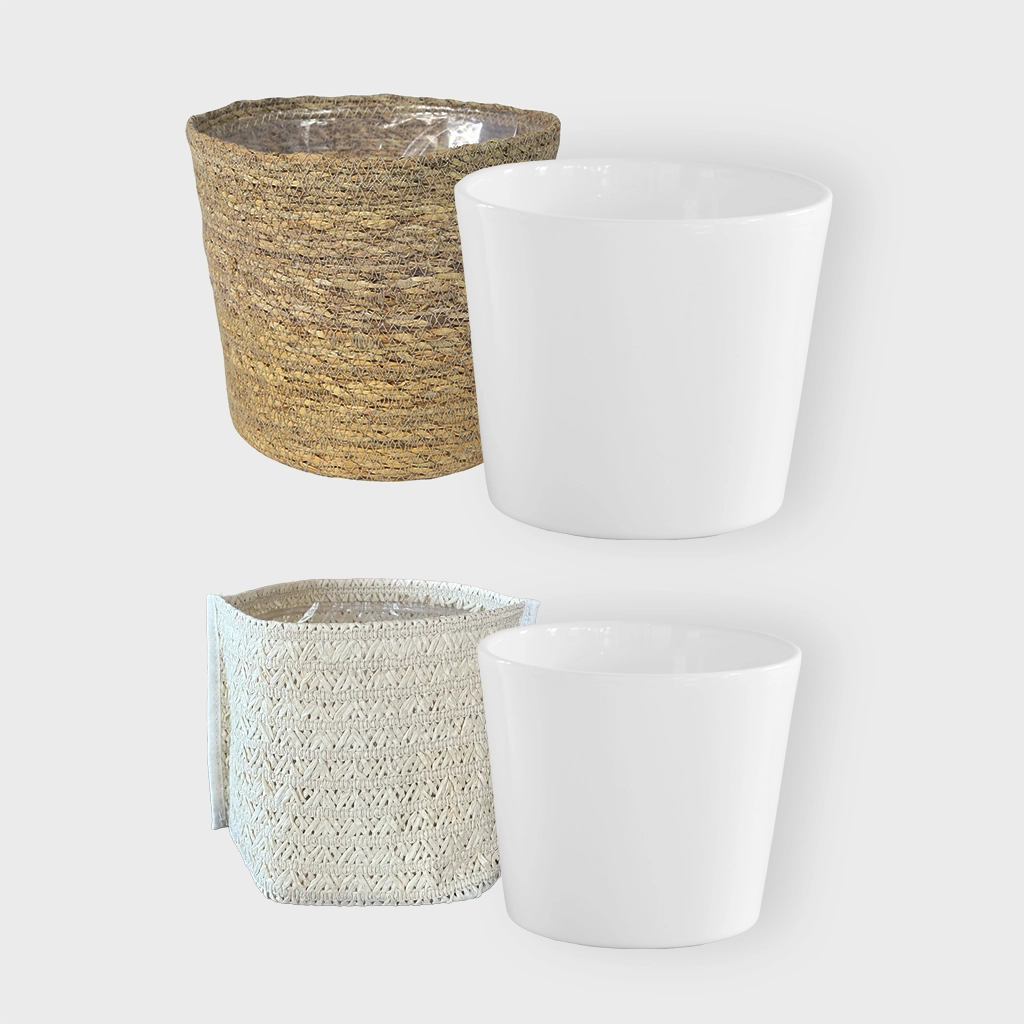 Dieses trendige Übertopf-Set haben wir dir passend zur 4er Pflanzenbox mit 2 großen und 2 kleinen Pflanze zusammengestellt. Die Töpfe sind eine Mischung aus Keramik und modernen Seegrastöpfen in natur. Die Innenseite der Körbe ist mit einer Kunststoffauskleidung versehen, die ein Auslaufen verhindert, jedoch sollte kein Wasser in den Gefäßen stehen. Einfach mit bestellen und deine neuen Pflanzen kinderleicht in deiner Wohnung dekorieren. Erhältlich in verschiedenen Farben.