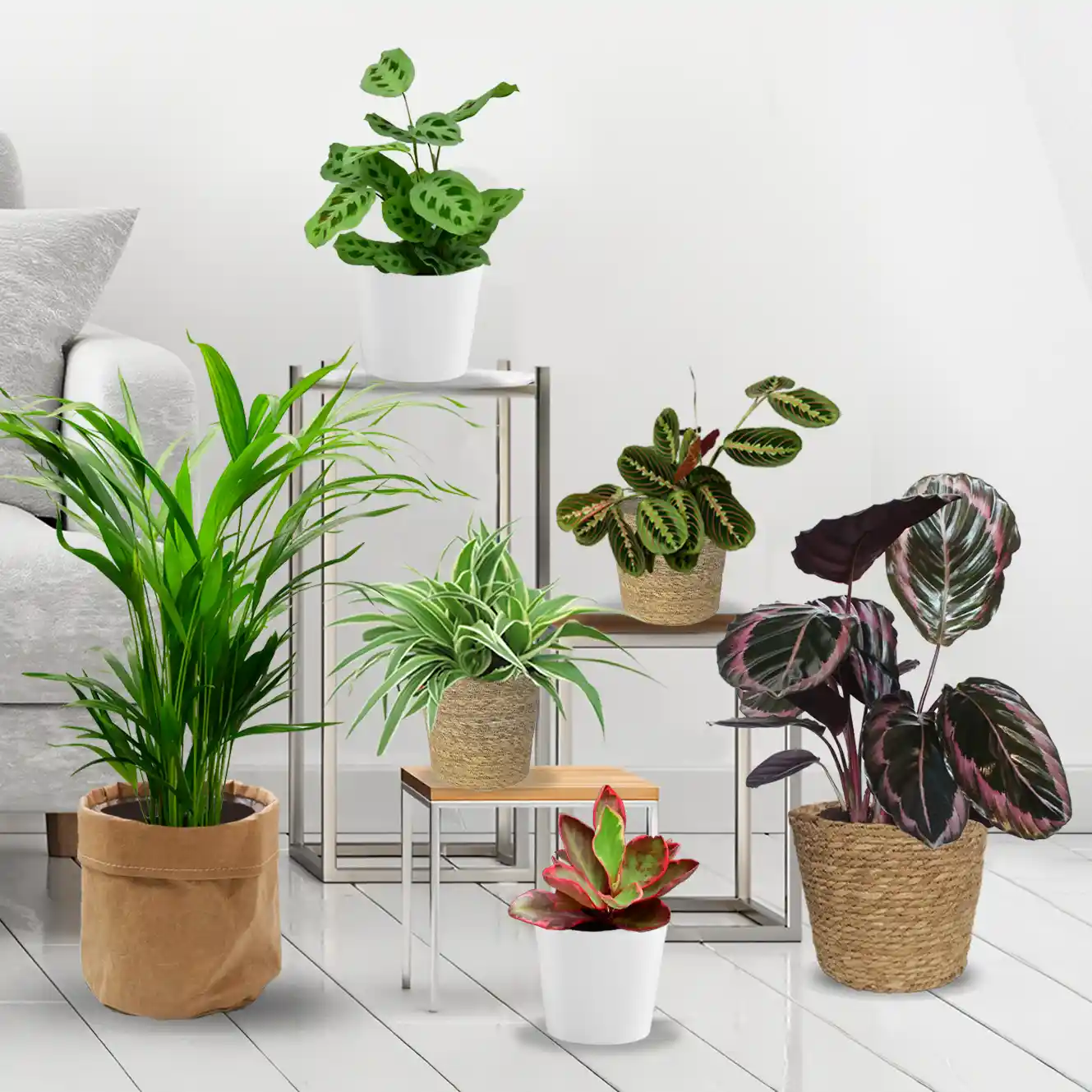 Die Pinke Calathea Crimson, die gemusterte Maranta Fascinator und die dunkle Pilea Norfolk sind die Highligst im Paket Die Dypsis Plame, die rosa Callisia und der gemusterte Zwergfeffer runden das Paket ab.