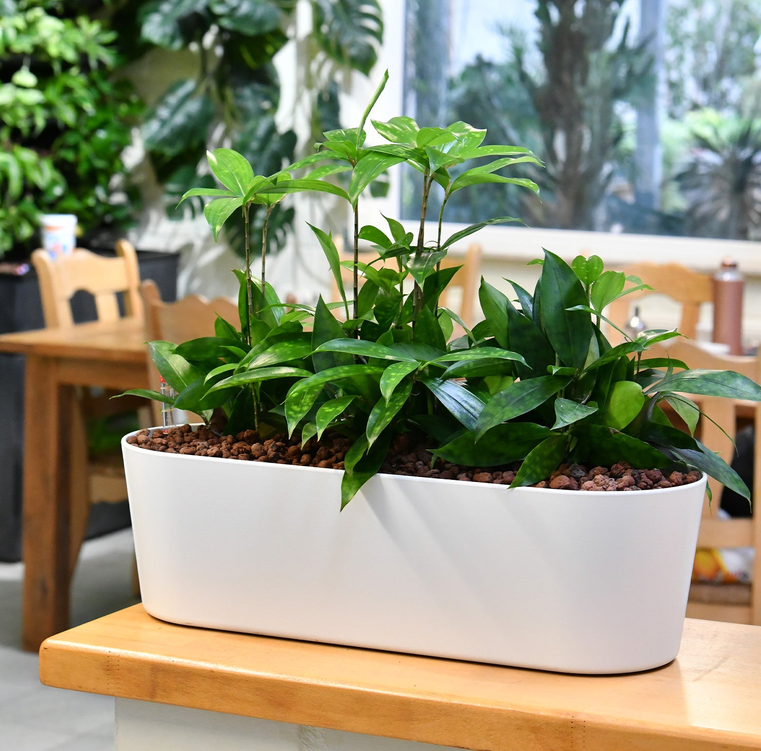 Die Bambuspflanzen sind eine pflegeleichte und trendige Pflanzendeko für die Empfangstheke oder ein Sideboard in deinem Business. Das längliche Pflanzgefäß mit 3 Bambuspflanzen in Hydrokultur eine professionell und langlebige Lösung.