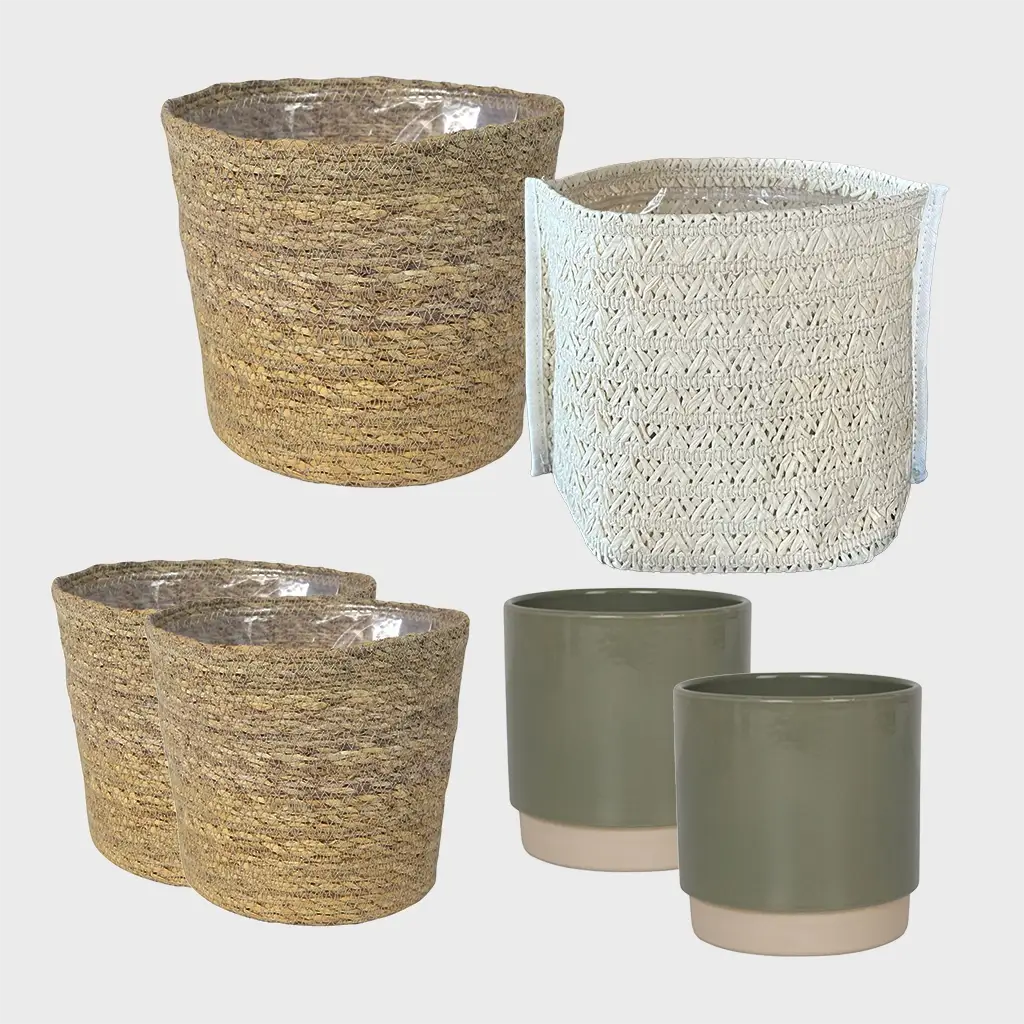 Dieses trendige Übertopf-Set passt perfekt zur 6er Pflanzenbox mit zwei großen und vier kleinen Pflanzen. Die Töpfe sind eine Mischung aus Keramik, Bast und trendigen Pflanzsäcken mit Innenfolie. Einfach mit bestellen und deine neuen Pflanzen kinderleicht in deiner Wohnung dekorieren. Erhältlich in verschiedenen Farben.