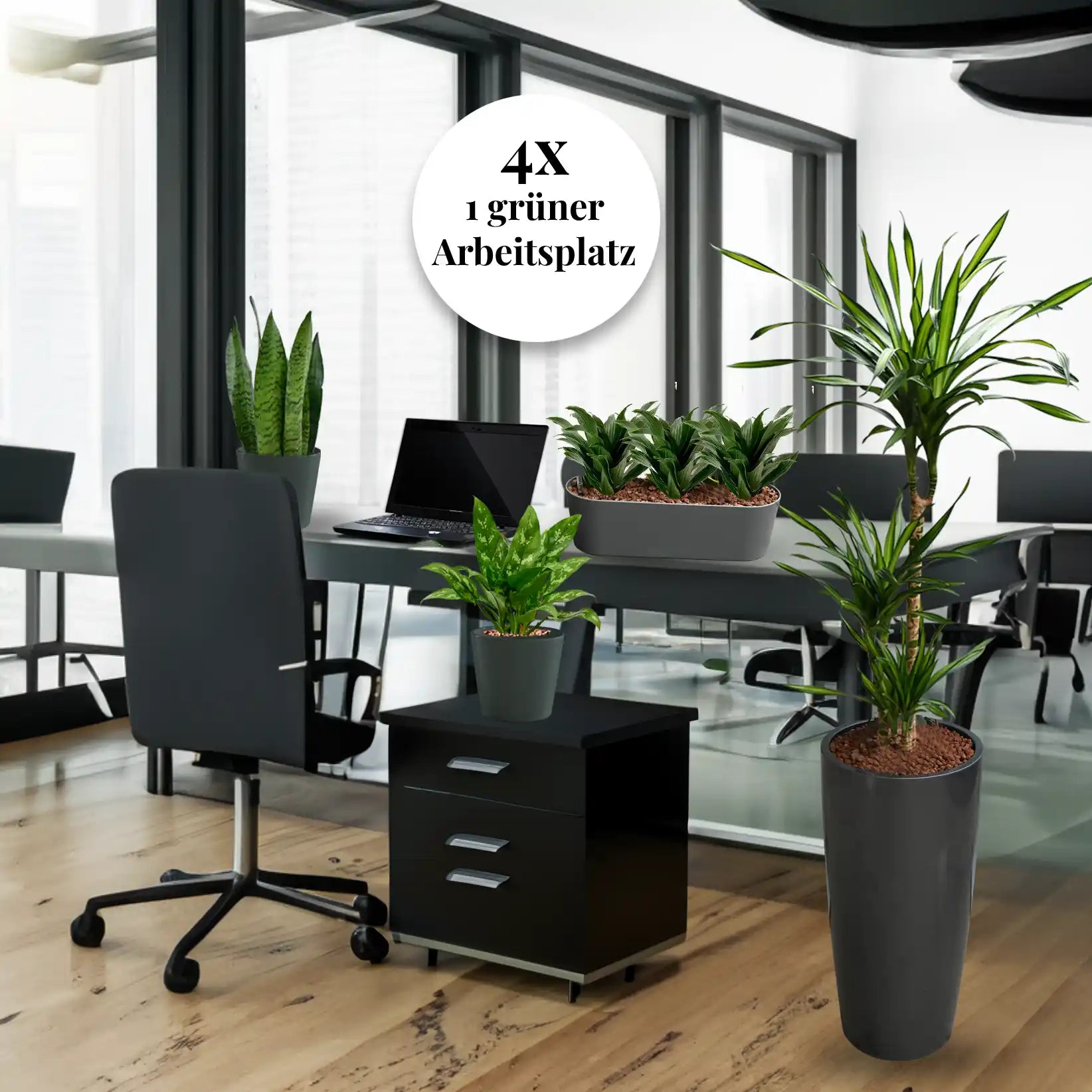 Diese komplette Ausstattung kann perfekt für 4 Arbeitsplätze oder ein Großraumbüro genutzt werden. Genauso gut machen die Pflanzen auch ein ganzes Ladenlokal grün oder erfrischen dein Restaurant.