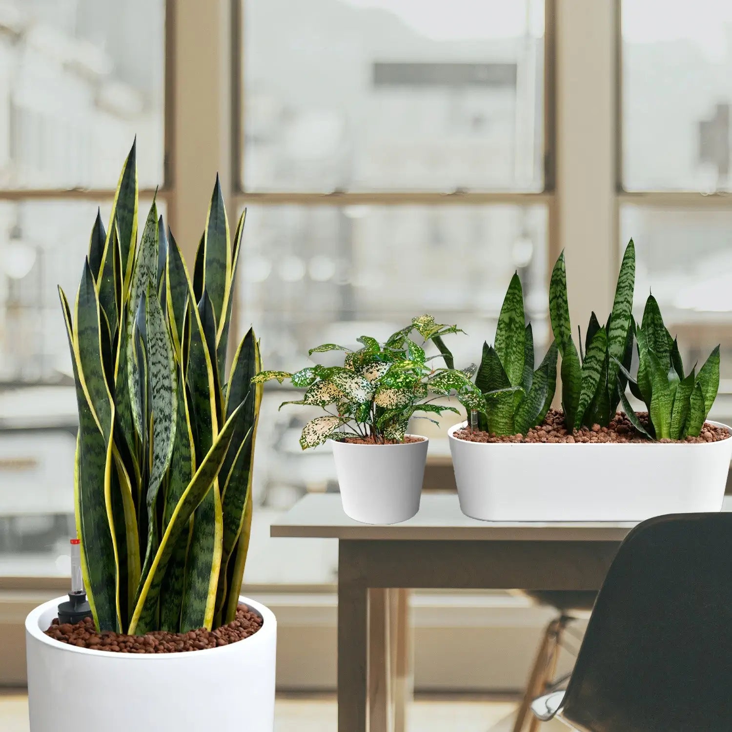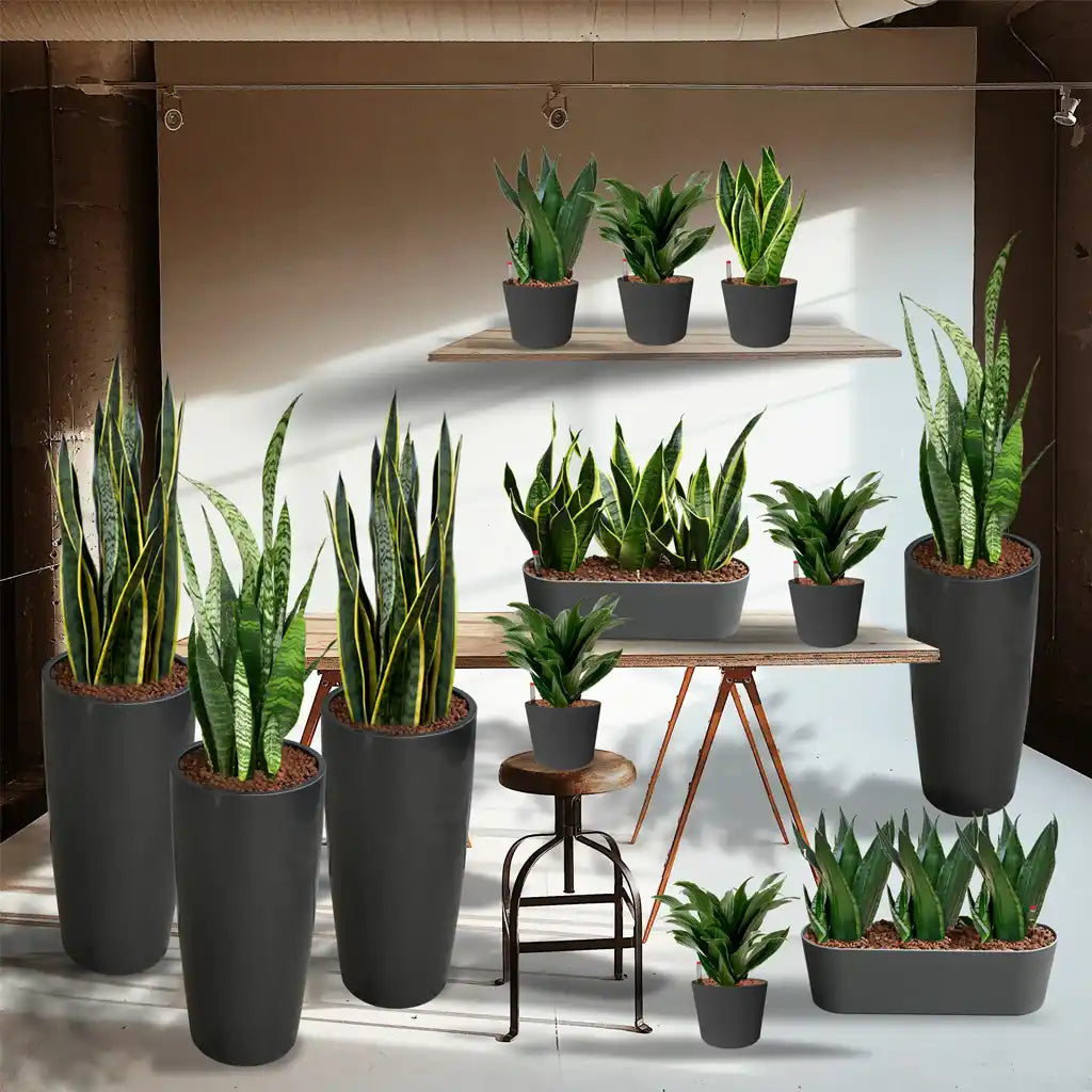 Bei den Pflanzen in diesem Paket haben wir besonders auf geradlinige Optik und sehr wenig Pflegbedarf geachtet. Die Pflanzenmischung aus Sansevieria, Zwergpfeffer und Croton Mischung passt ideal in moderne Büros ohne viel Schnick-Schnack und durch die vielen Sukkulenten ist sie auch sehr gut für sonnige Büros mit Südfenstern geeignet.