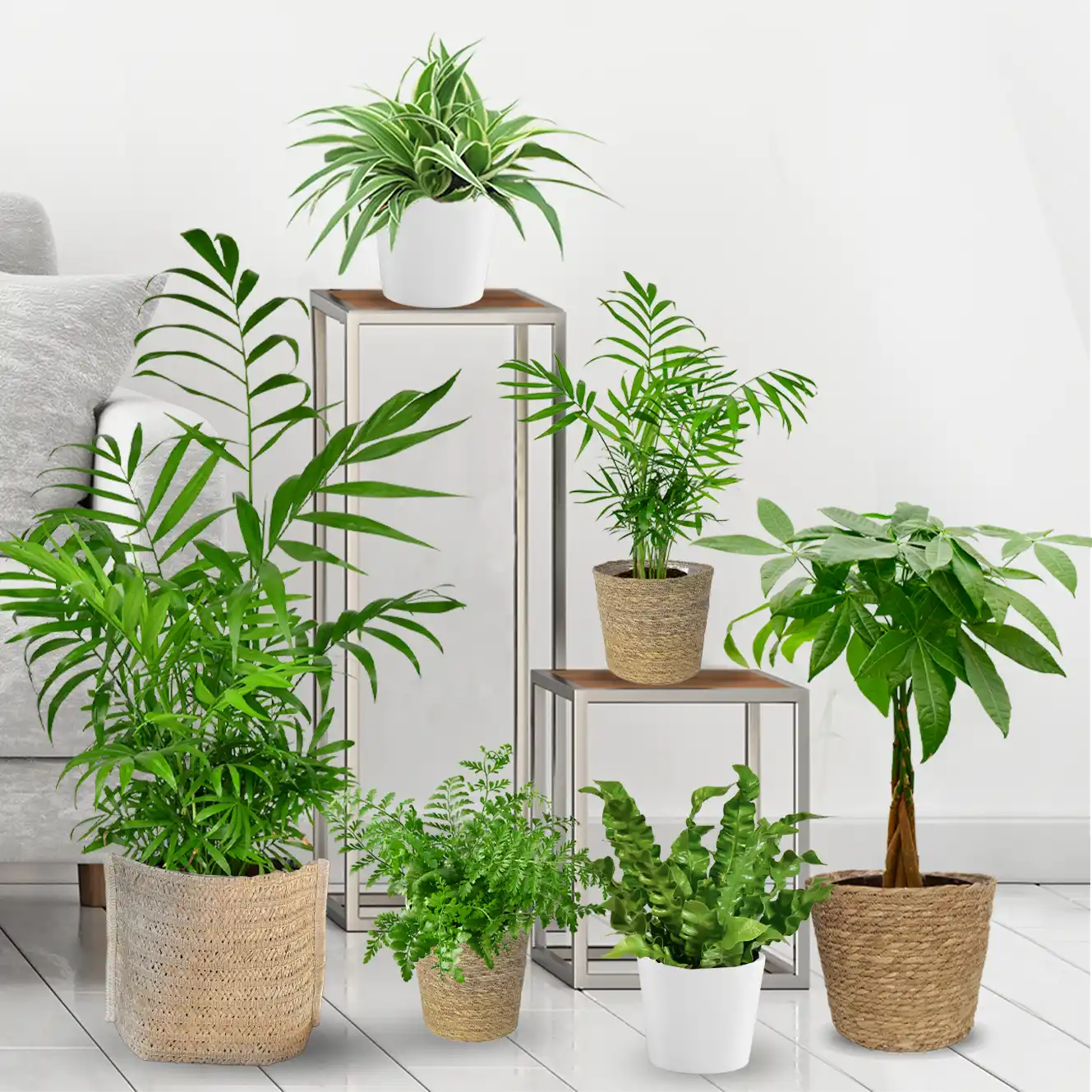 Dieses trendige Übertopf-Set passt perfekt zur 6er Pflanzenbox mit zwei großen und vier kleinen Pflanzen. Die Töpfe sind eine Mischung aus Keramik, Bast und trendigen Pflanzsäcken mit Innenfolie. Einfach mit bestellen und deine neuen Pflanzen kinderleicht in deiner Wohnung dekorieren. Erhältlich in verschiedenen Farben.
