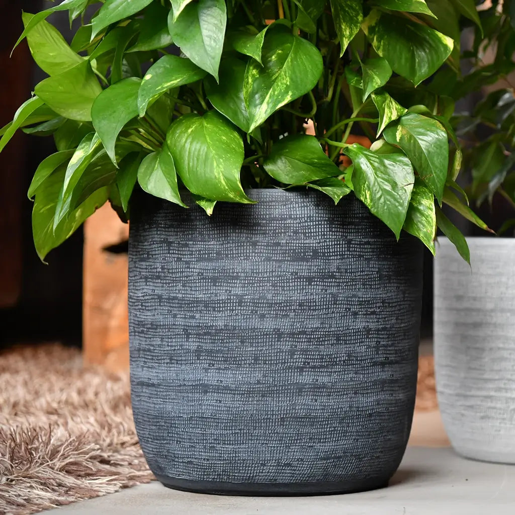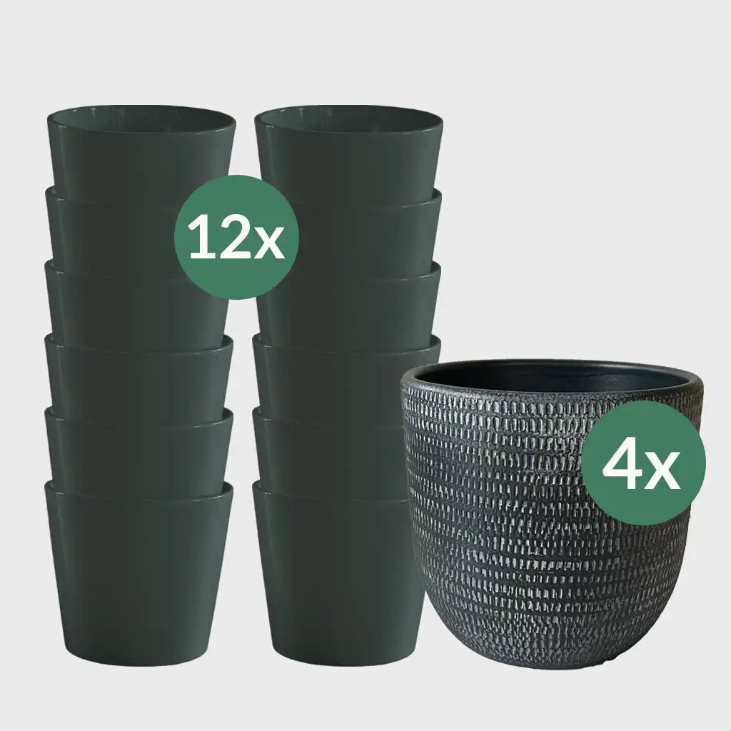 Statte deine 4 großen Hydropflanzen und 12 Schreibtischpflanzen mit Keramiktöpfen aus. Edel und schlicht passt der anthrazitfarbene Übertopf gut in jedes Büro, Praxis oder Ladenlokal. Die dezenten weißen Einkerbungen machen den Topf zu einem besonderen Highlight.