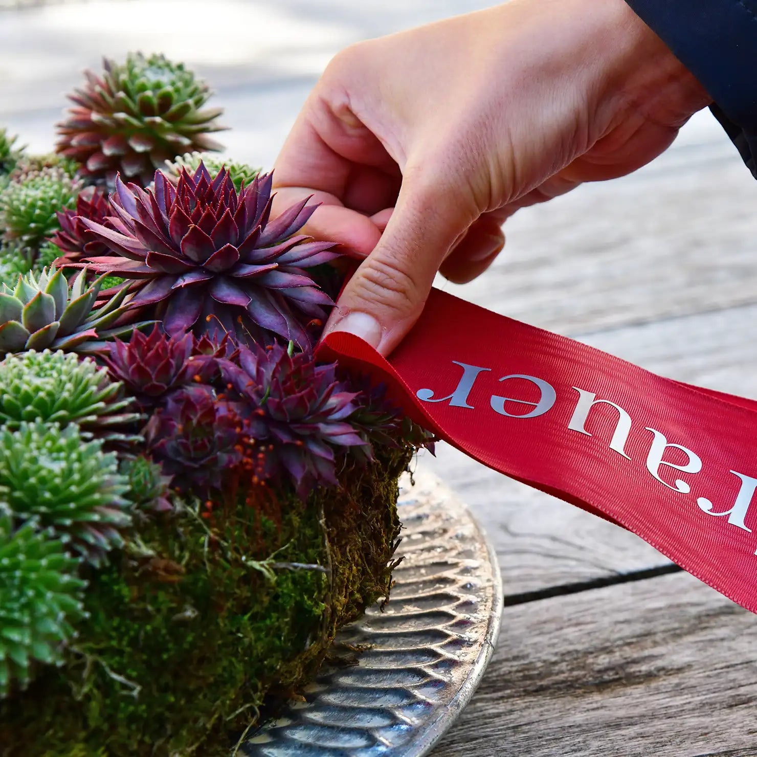 Unsere Kränze bestehen ausschließlich aus zwei natürlichen Komponenten: winterhartem Torfmoos und mehrjährigen Hauswurzpflanzen. Die Ableger der Sempervivum werden von Hand auf das Moos gesetzt. Innerhalb weniger Monate verwurzeln sie fest im Kranz – nach rund einem Jahr ist der gesamte Kranz rundum bewachsen.